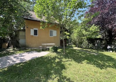A kert gondozott, ősfákkal beültetett. Az épület körül több tároló is helyet kapott.